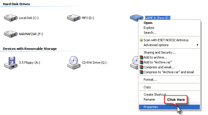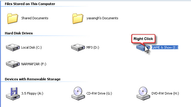 1- ابتدا روی درایوی که دچار مشکل شده است راست کلیک کنید